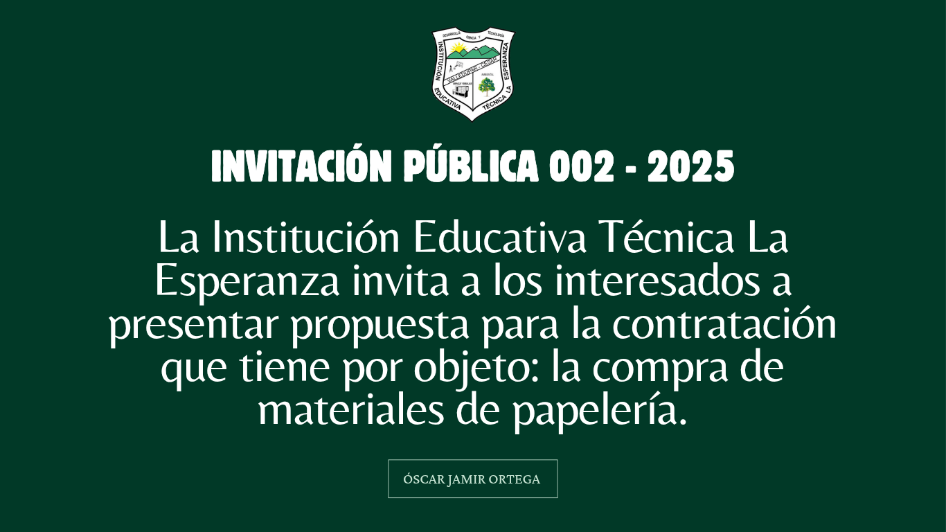 La Institución Educativa Técnica La Esperanza invita a los interesados a presentar propuesta para la contratación que tiene por objeto: la compra de materiales de papelería