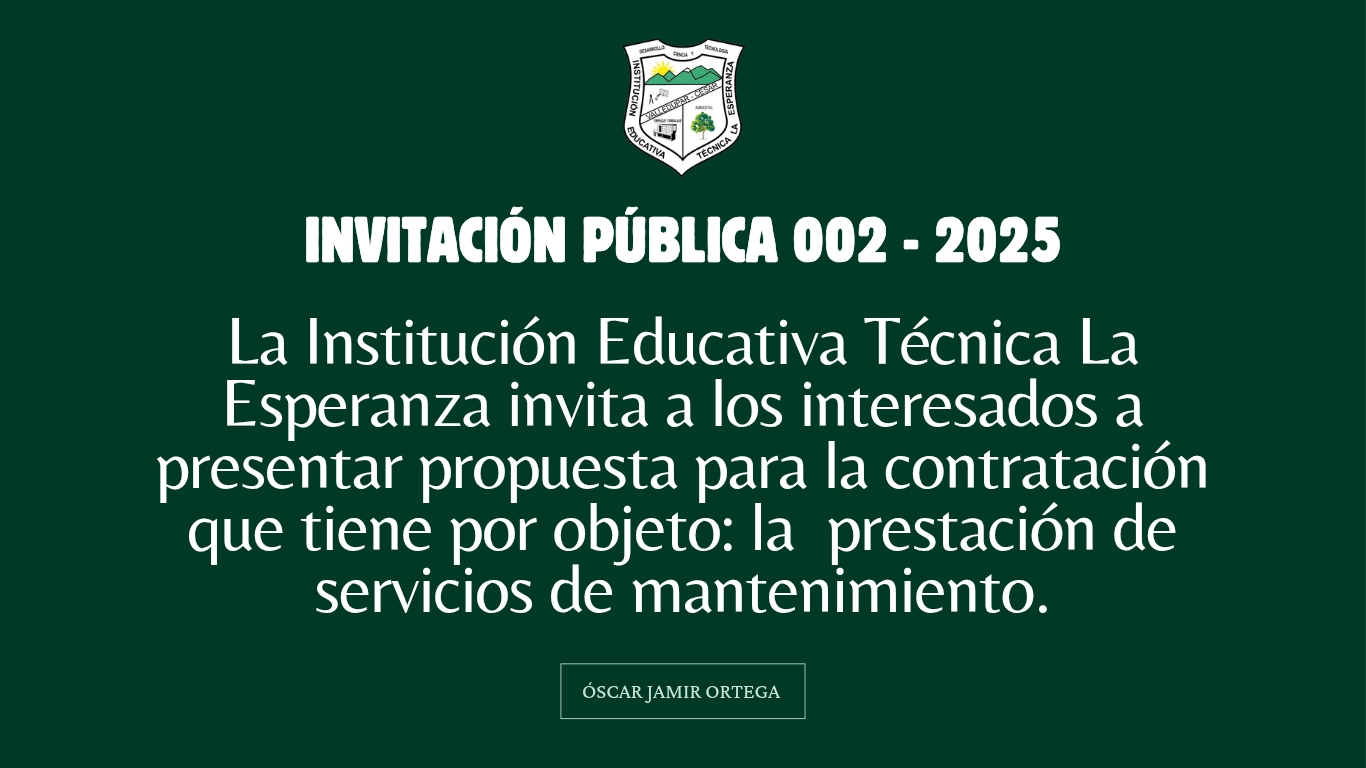 La Institución Educativa Técnica La Esperanza en aplicación a la Ley 1150 de 2007, Decreto 1082 de 2015, entre otros, invita a los interesados a presentar propuesta para realizar un contrato de prestación de servicios de mantenimiento al sistema de fontanería, ornamentación, cerrajería y demás actividades de mantenimiento físico.