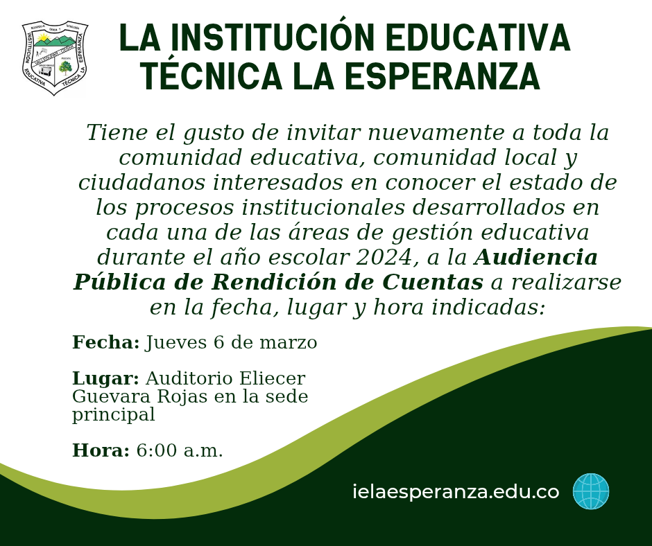 La Institución Educativa Técnica la Esperanza, tiene el gusto de invitar nuevamente a toda la comunidad educativa, comunidad local y ciudadanos interesados en conocer el estado de los procesos institucionales desarrollados en cada una de las áreas de gestión educativa durante el año escolar 2024, a la Audiencia Pública de Rendición de Cuentas a realizarse en la fecha, lugar y hora indicadas: