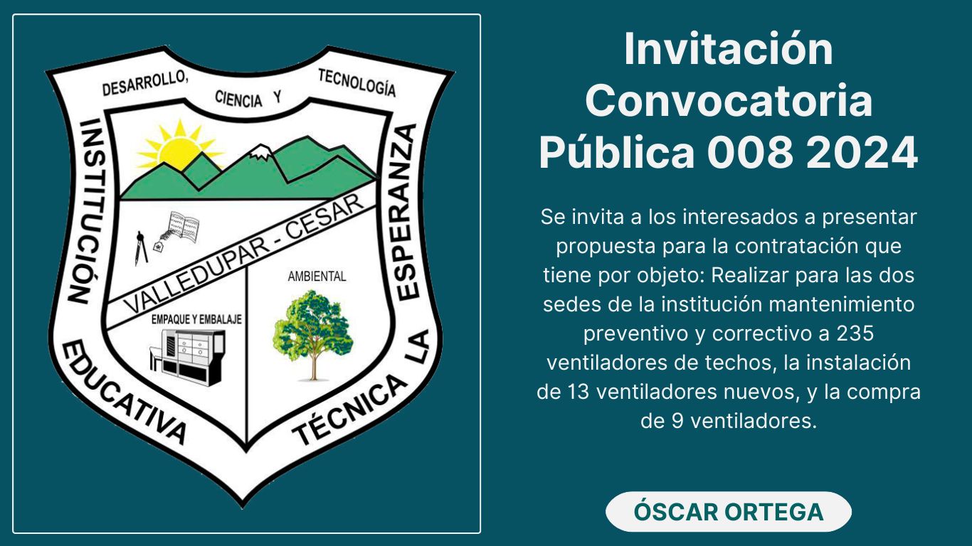 En cumplimiento de la política de rendición de cuentas La Institución Educativa Técnica La Esperanza, tiene el gusto de invitar a la comunidad educativa a la Audiencia Pública de Rendición de Cuentas vigencia 2023, la cual se realizará el día miércoles 13 de marzo de 2024 en las instalaciones del coliseo de la sede principal de la institución de 9:30 a.m. a 12:00 m.